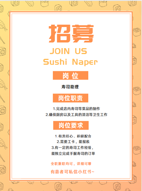 Sushi Naper 招人啦!寿司助手,后厨帮厨快来 [寿司助手]
